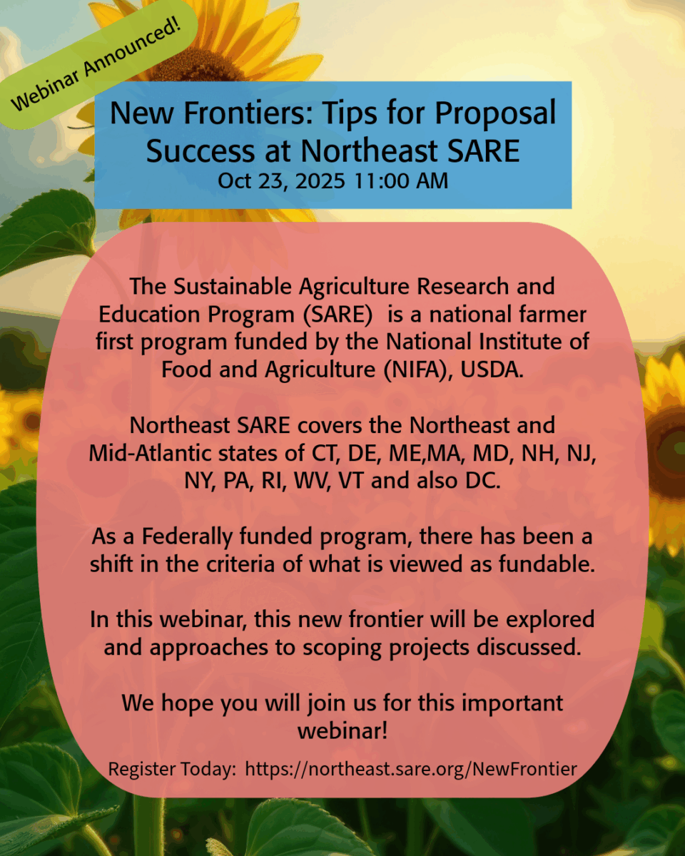The Sustainable Agriculture Research and Education Program (SARE) is a national farmer first program funded by the National Institute of Food and Agriculture (NIFA), USDA. Northeast SARE covers the Northeast and Mid-Atlantic states of CT, DE, ME,MA, MD, NH, NJ, NY, PA, RI, WV, VT and also DC. As a Federally funded program, there has […]