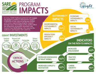 In 2023, the SARE National Reporting, Coordination, and Communications Office (NRCCO) contracted with Insight for Action to conduct a post-project evaluation of four of SARE's regional grant programs. The purpose of the evaluation was to characterize key impacts made by SARE’s grantmaking from 2016 through 2023. The evaluation employed the Success Case Method (SCM) to identify program impacts grounded in a theory- and practice-informed impact model.